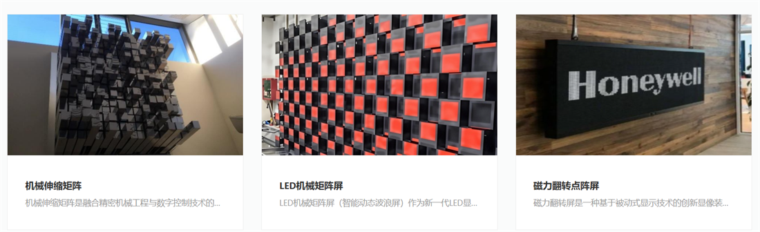 天马智显是一家专注于创意显示、自动化矩阵类技术解决方案的高新技术企业,产品包括磁力点阵屏、机械矩阵屏(波浪屏)、翻转矩阵、矩阵翻牌、升降矩阵等,支持定制。我们致力于将机械技术与创意显示深度融合,为全球客户提供独特、高效且富有视觉冲击力的显示产品与服务。我们具备硬核的技术研发团队公司质量体系完善。秉承“深耕技术 精细制造 客户第一 服务至上”的价值理念;从定制化的机械显示屏到互动式的创意展示装置,我们的矩阵伸缩屏、矩阵沙盘、浮球矩阵产品和方案广泛应用在军事推演仿真、展览展示、艺术空间、商业零售空间、舞台演绎、文旅互动等领域,为每一个场景注入独特的魅力与活力。 我们以“创意点亮视界,驱动显示革新”为使命,不断突破传统显示的局限。机械创意显示屏采用模块化设计,可根据客户需求灵活组合,实现从平面到立体、从静态到动态的多样化显示效果。同时,结合智能控制技术,极大提升了使用便捷性和维护效率。 机械矩阵创意显示不仅追求技术的卓越,更注重用户体验,以创新为驱动,以客户需求为导向,不断探索显示技术的新可能,用科技点亮创意视界,用创意驱动显示革新,让世界因我们的创意显示而更加精彩。 联系人:王总 手机:13051132206 店铺:https://b2b.baidu.com/shop/74235787